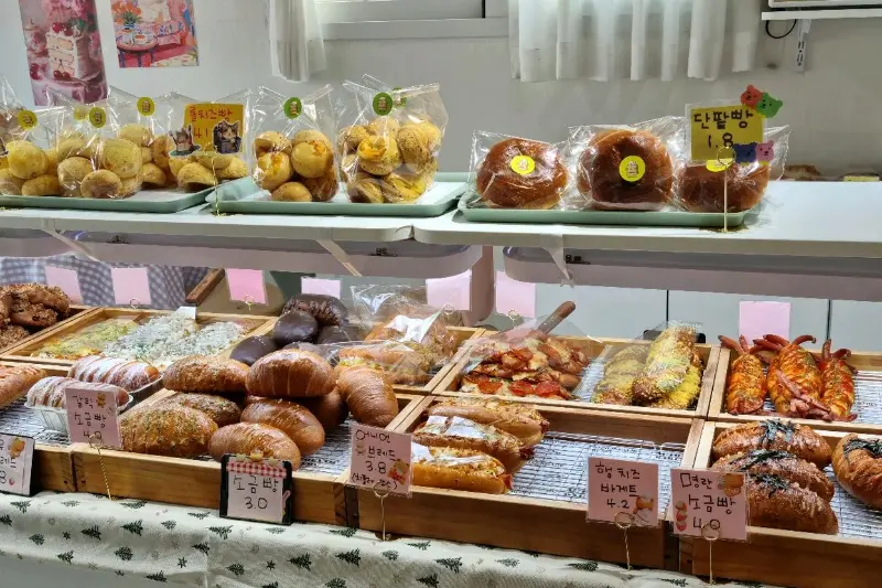 계산대 옆에는 귀여운 소품들이 진열되어 있었다. 빵 모양의 인형, 아기자기한 그림, 그리고 손글씨로 쓰인 메뉴판까지. 빵집 전체가 사장님의 따뜻한 감성으로 가득 채워진 느낌이었다.