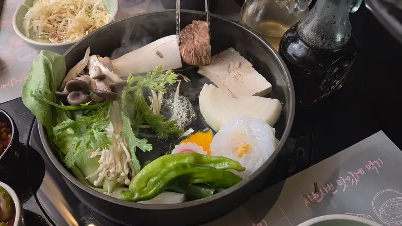 가장 먼저, 냄비에 버터를 두르고 소고기를 살짝 구워 풍미를 더했다. 그 위에 양파, 대파, 배추 등 다양한 야채를 넣고 특제 소스를 부어 자작하게 끓였다. 끓어오르는 동안 퍼지는 달콤 짭짤한 향기는 기다림마저 즐겁게 만들었다.