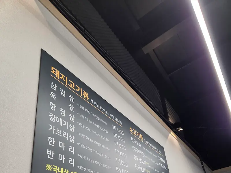 식당 안으로 들어서자, 테이블 위에서 피어오르는 연기와 함께 사람들의 웃음소리가 정겹게 느껴졌다. 이미 여러 테이블이 손님들로 북적이고 있었고, 빈자리를 찾기가 쉽지 않았다. 다행히 한쪽 구석에 자리를 잡을 수 있었다. 메뉴판을 펼쳐보니, 돼지고기 한 마리 세트가 눈에 띄었다. 삼겹살, 항정살, 가브리살 등 다양한 부위를 한 번에 맛볼 수 있다는 점이 매력적이었다.