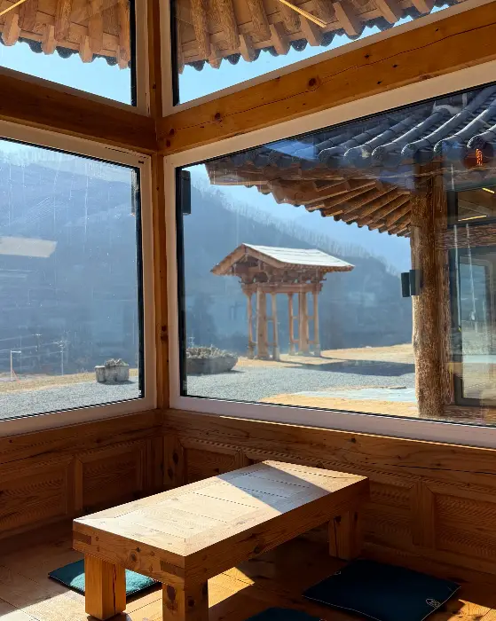 안으로 들어서니, 툇마루를 따라 쭉 이어지는 나무 기둥과 서까래가 시선을 사로잡았어요. 고전적인 아름다움과 현대적인 감각이 절묘하게 조화를 이루는 공간이었죠. 창밖으로는 푸른 산과 하늘이 그림처럼 펼쳐져 있는데, 마치 액자 속에 담긴 풍경 같았어요. 맑은 공기, 잔잔한 바람, 그리고 들려오는 새소리까지, 모든 것이 완벽한 조화를 이루고 있었답니다.