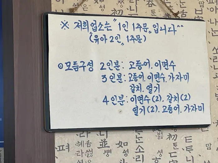 1인 주문은 불가하며, 인원에 따라 생선 구성이 달라지는 독특한 시스템을 안내하는 메뉴판.