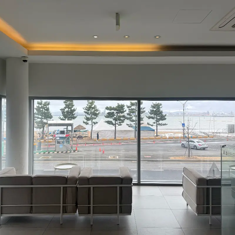 아라비카러스터즈 통창으로 보이는 영일대 해변 뷰