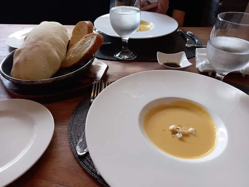 자리에 앉자마자 따끈한 스프와 식전빵이 나왔다. 빵은 겉은 살짝 바삭하고 속은 촉촉한, 딱 내가 좋아하는 스타일! 특히 빵에서 은은하게 느껴지는 양파 향이 진짜 신의 한 수였다. 짭짤하면서도 고소한 맛이 입맛을 확 돋우는 게, 메인 메뉴에 대한 기대감을 더욱 높였다. 스프는 부드럽고 따뜻해서 속을 편안하게 달래주는 느낌. 크루통 몇 개 톡톡 얹어 먹으니 순식간에 사라졌다.