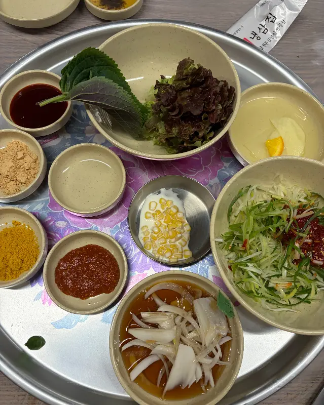 쌈 채소는 기본, 파채, 김치, 쌈무, 옥수수콘 샐러드까지! 특히 쌈무는 유자 소스가 뿌려져 있어 상큼함을 더했다. 고기 먹을 때 쌈무 없으면 섭섭한데, 여기는 맛까지 신경 쓴 게 느껴졌다. 그리고 맘에 쏙 들었던 건, 다양한 소스! 쌈장, 기름장, 멜젓은 기본이고, 특제 양념 소스까지 준비되어 있었다. 취향에 따라 다양하게 즐길 수 있다는 점이 아주 만족스러웠다.