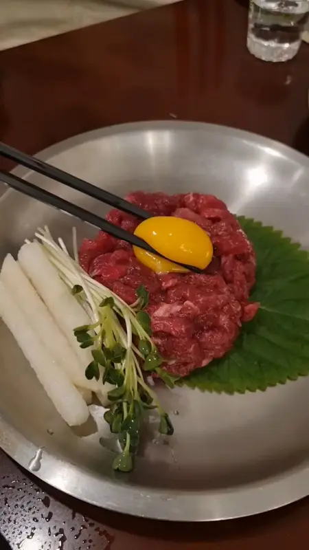 같이 나온 갓김치랑 같이 먹어도 진짜 꿀맛! 갓김치의 알싸한 맛이 육회의 느끼함을 잡아주면서 입안을 개운하게 만들어주더라고. 솔직히 육회만 먹어도 맛있지만, 갓김치랑 같이 먹으면 질릴 틈 없이 계속 먹을 수 있어.