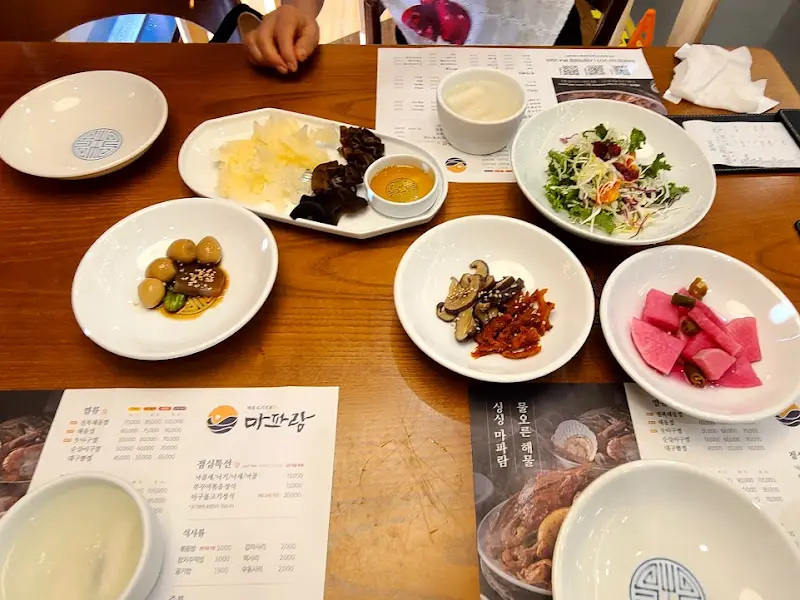 주문을 마치자마자, 밑반찬들이 쫙 깔리는데… 와, 진짜 하나하나 정갈하고 맛깔스러워 보이는 게, 메인 메뉴 나오기 전부터 이미 기대감 폭발! 특히 버섯을 김에 싸서 참기름에 콕 찍어 먹는 거… 이거 진짜 별미더라! 뭔데, 뭔데 이렇게 맛있어?! 샐러드도 드레싱이 상큼해서 입맛을 돋우기에 딱이었고, 슴슴하게 간이 된 반찬들도 해물탕이랑 같이 먹으니 진짜 환상의 조합이었다.