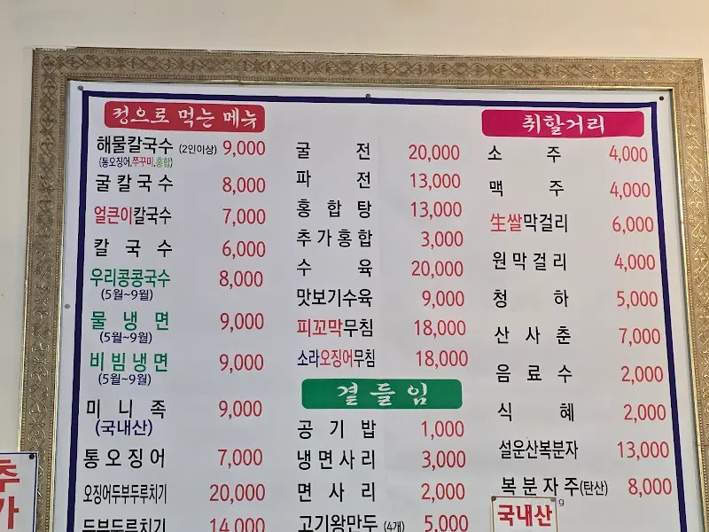홍두깨 해물굴칼국수 메뉴판