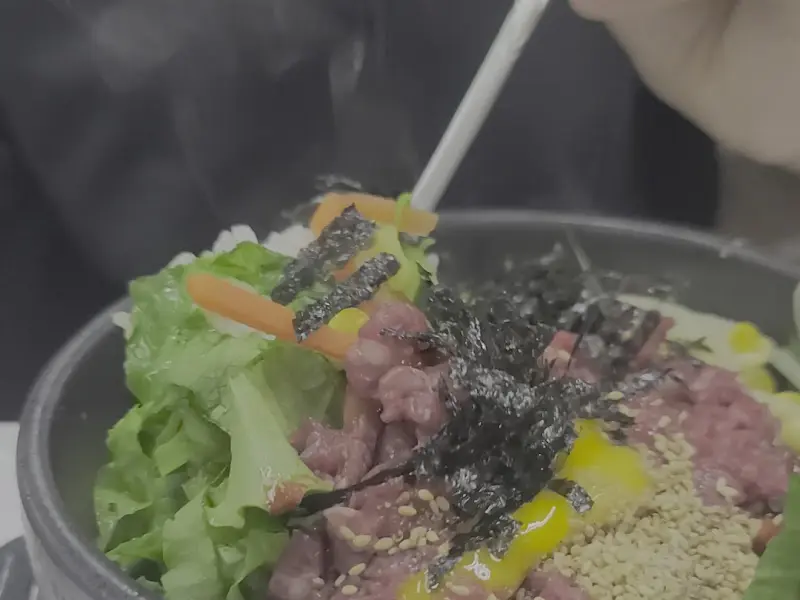 특히 육회비빔밥 사진은 정말 먹음직스러웠다. 신선한 육회와 야채, 그리고 고소한 김 가루가 환상적인 조화를 이루고 있었다. 젓가락으로 비비는 모습은 보는 것만으로도 군침이 돌았다. 육회의 윤기와 신선함이 사진 속에서도 느껴졌다.