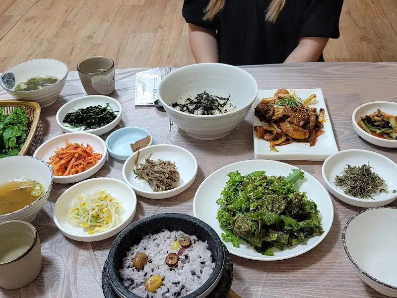 잠시 후, 상상 이상의 풍성한 한 상이 차려졌습니다. 돌솥밥은 밤과 은행이 넉넉하게 들어가 있었고, 윤기가 자르르 흐르는 밥알은 보기만 해도 식욕을 자극했습니다. 밥과 함께 나온 반찬들은 하나하나 정갈하고 맛깔스러웠습니다. 묵은 김치, 물김치, 샐러드 무침, 무채, 콩나물 무침, 배추나물, 무나물, 멸치볶음, 표고버섯볶음 등 무려 열 가지가 넘는 반찬들이었는데, 모두 신선하고 깔끔한 맛이었습니다. 특히 제 입맛을 사로잡은 것은 숯불 향이 은은하게 배어 있는 제육볶음이었습니다.