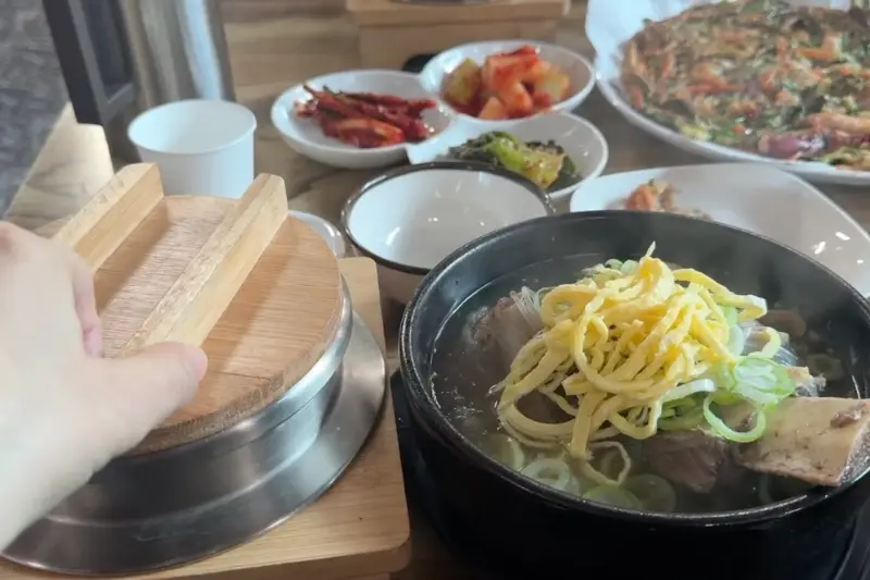 메뉴판을 펼쳐 들고 고민에 빠졌다. 갈비탕, 설렁탕, 해물파전 등 다채로운 메뉴들이 눈길을 사로잡았다. 특히 뜨끈한 솥밥에 왕갈비가 들어간 갈비탕은 도저히 놓칠 수 없는 메뉴였다. 결국 갈비탕과 해물파전을 주문하기로 결정했다. 잠시 후, 정갈하게 차려진 밑반찬들이 테이블 위에 놓였다.
