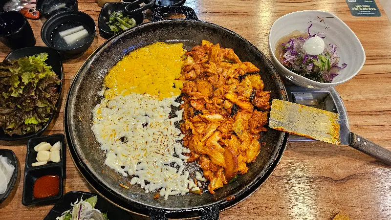 쭉쭉 늘어나는 치즈에 닭갈비를 찍어 먹으면 천상의 맛!