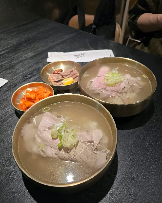 돼지곰탕의 첫인상은 ‘맑음’ 그 자체였다. 뽀얀 사골 국물이 아닌, 투명에 가까운 육수가 놋그릇에 담겨 나왔다. 마치 잘 정제된 실험 용액을 보는 듯하다. 국물 위에는 얇게 슬라이스 된 돼지고기 앞다리살이 넉넉하게 올려져 있고, 송송 썰린 파가 시각적인 청량감을 더한다.