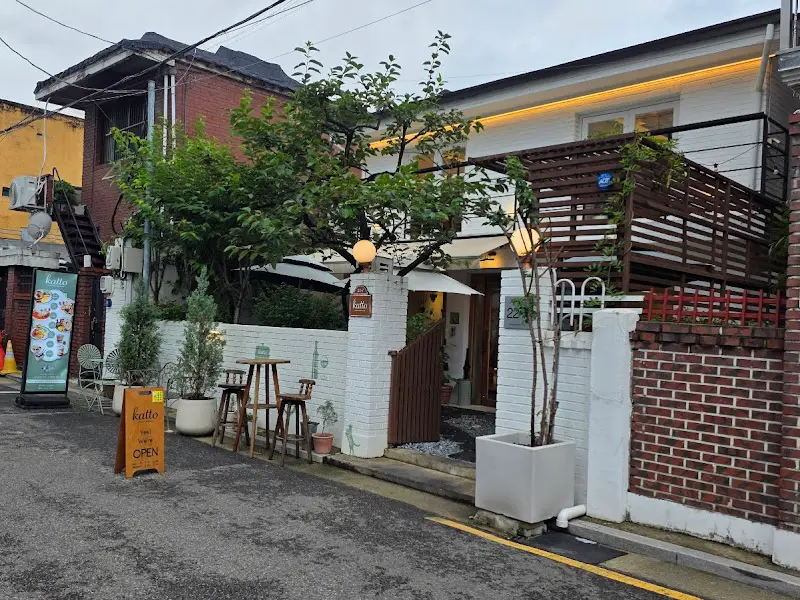 입구부터가 심상치 않았다. 붉은 벽돌과 하얀 담벼락이 어우러진 외관은 마치 유럽의 작은 마을에 온 듯한 느낌을 줬다. 담벼락에 붙어있는 나무 간판에는 “katto Brunch & Dinner Cafe”라고 적혀 있었다. 사진을 안 찍을 수가 없잖아? 바로 폰을 꺼내 셔터를 눌렀다.