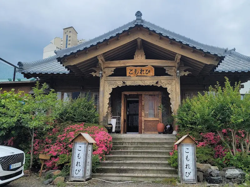 드디어 코모레비 앞에 도착. 가장 먼저 눈에 들어온 건, 일본 전통 건축 양식을 그대로 옮겨 놓은 듯한 외관이었다. 지붕의 곡선은 중력의 법칙을 거스르는 듯 우아했고, 나무로 짜 맞춘 문살은 햇빛을 받아 은은하게 빛나고 있었다. 마치 에도시대로 순간 이동한 기분이랄까. 입구 양쪽에 놓인 작은 안내판에는 정갈한 글씨로 ‘코모레비’라는 상호가 적혀 있었다.