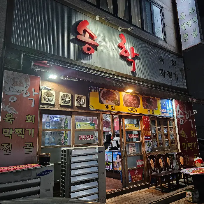밤의 장막이 짙게 내려앉은 울산 명촌의 어느 거리, 그곳에 발을 들여놓는 순간부터 무언가 특별한 경험이 기다리고 있음을 직감했습니다. 늦은 저녁 시간이었음에도 불구하고, 가게 안에서 새어 나오는 은은한 불빛과 왁자지껄한 소리는 이곳이 단순한 식당 이상의 공간임을 짐작게 했습니다. 낡은 간판에 붉은 글씨로 새겨진 ‘송학’이라는 이름은 세월의 깊이를 말해주는 듯했고, 그 앞에 선 순간, 어쩌면 오랜 시간 동안 많은 이들의 발길을 사로잡아왔을 이곳에 대한 기대감이 차올랐습니다.