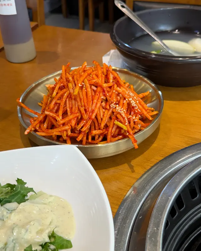 함께 나온 무생채는 돼지갈비의 맛을 한층 더 끌어올리는 ‘치트키’였다. 아삭하고 시원한 무생채는 돼지갈비의 느끼함을 잡아주면서, 입안을 개운하게 만들어 줬다. 돼지갈비와 무생채를 함께 먹으니, 마치 오래된 연인처럼 완벽한 궁합을 자랑했다. 젓가락질을 멈출 수 없는 마성의 조합이었다.