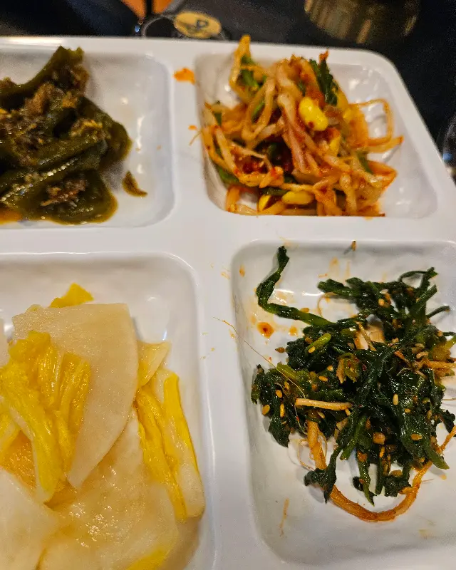 자리에 앉자마자 눈에 들어온 것은 테이블마다 놓인 특별한 불판이었다. 숯불의 은은한 온기가 감도는 불판 가장자리에는 계란 크러스트를 즐길 수 있는 공간이 마련되어 있었다. 기다리는 동안 기본 찬들이 차려졌다. 하나하나 정갈하게 담긴 반찬들은 마치 어머니가 손수 만들어 주신 듯한 따뜻함이 느껴졌다. 특히 냉이가 들어간 된장찌개는 깊고 시원한 맛이 일품이었다. 쌉싸름한 냉이 향이 찌개 전체의 풍미를 끌어올려, 숯불에 구워진 고기와 환상적인 조화를 이룰 것 같은 예감이 들었다.