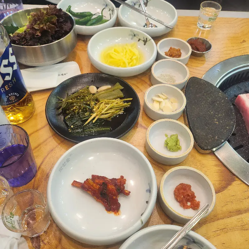 잘 구워진 삼겹살은 쌈으로 먹어도 맛있지만, 맛찬들왕소금구이에서는 다양한 곁들임 메뉴와 함께 즐기는 것이 더욱 특별하다. 깻잎 장아찌에 싸서 먹으면 향긋한 풍미가 더해지고, 갓김치와 함께 먹으면 아삭한 식감과 매콤한 맛이 느끼함을 잡아준다. 특히 콩나물 무침과 명란젓의 조합은 정말 최고였다. 짭짤한 명란젓과 아삭한 콩나물 무침이 삼겹살의 풍미를 더욱 풍성하게 만들어주었다.