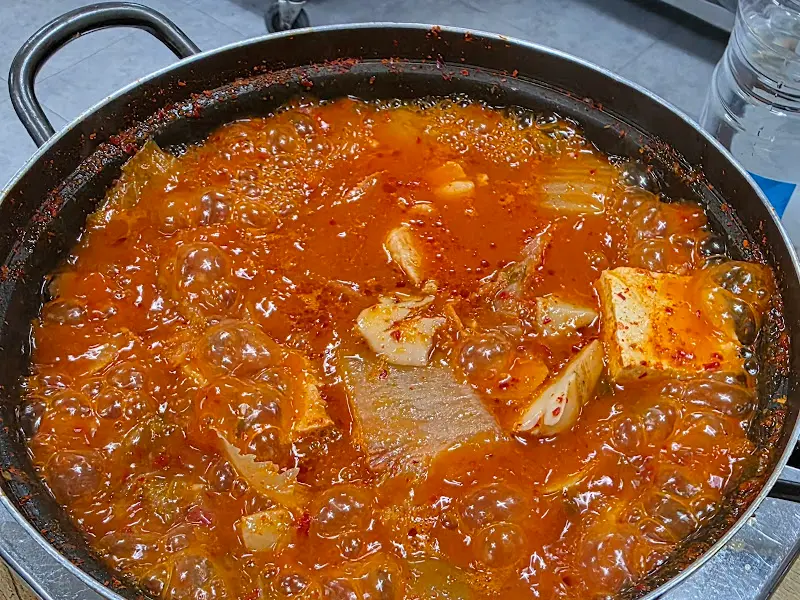 주문하고 얼마 지나지 않아, 놋으로 된 묵직한 냄비 뚜껑이 덮인 채로 김치찌개가 등장했어. 어찌나 김이 모락모락 나던지, 뚜껑을 열기도 전에 입안에 침이 고이더라. 냄비 안에서는 붉은 김치와 큼지막한 돼지고기가 어우러져, 쉴 새 없이 보글보글 끓고 있었어 .