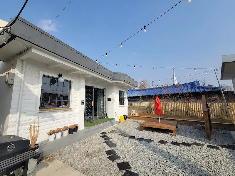 골목 어귀를 돌자, 짜잔! 마치 동화 속에 나올 법한 아담한 흰색 건물이 눈에 들어왔다. 외관부터가 심상치 않아. 파란 하늘 아래 하얀 벽돌 건물이 그림처럼 놓여 있는데, 그 앞에 놓인 빨간 파라솔이 포인트! 왠지 모르게 유럽 작은 마을의 브루어리에 온 듯한 느낌이랄까? 입구 옆에는 앙증맞은 화분들이 옹기종기 모여 있고, 흑색 벽돌이 드문드문 놓인 길을 따라 안으로 들어가는 길이 묘하게 낭만적이다.