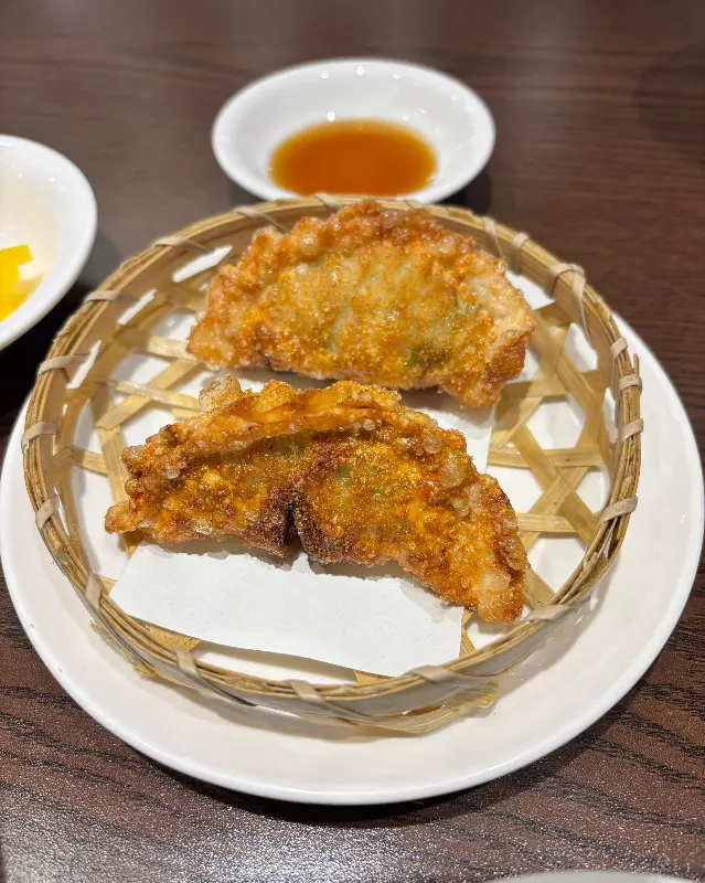 주문하고 얼마 지나지 않아서 드디어 기다리고 기다리던 군만두 등장! 와… 비주얼부터가 장난 아니더라. 겉은 완전 바삭바삭해 보이고, 속은 육즙으로 가득 차 있을 것 같은 느낌적인 느낌! 젓가락으로 살짝 들어봤는데, 묵직한 무게감에 다시 한번 감탄했어. 사진에서 보던 것보다 훨씬 컸거든.