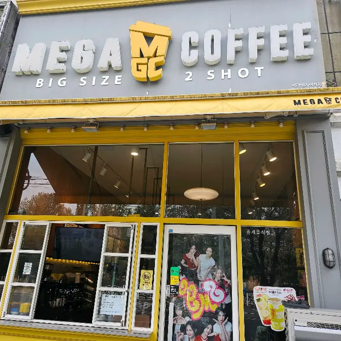 노란색과 그레이의 조합이 눈에 띄는 메가커피 화봉점 외관이에요.