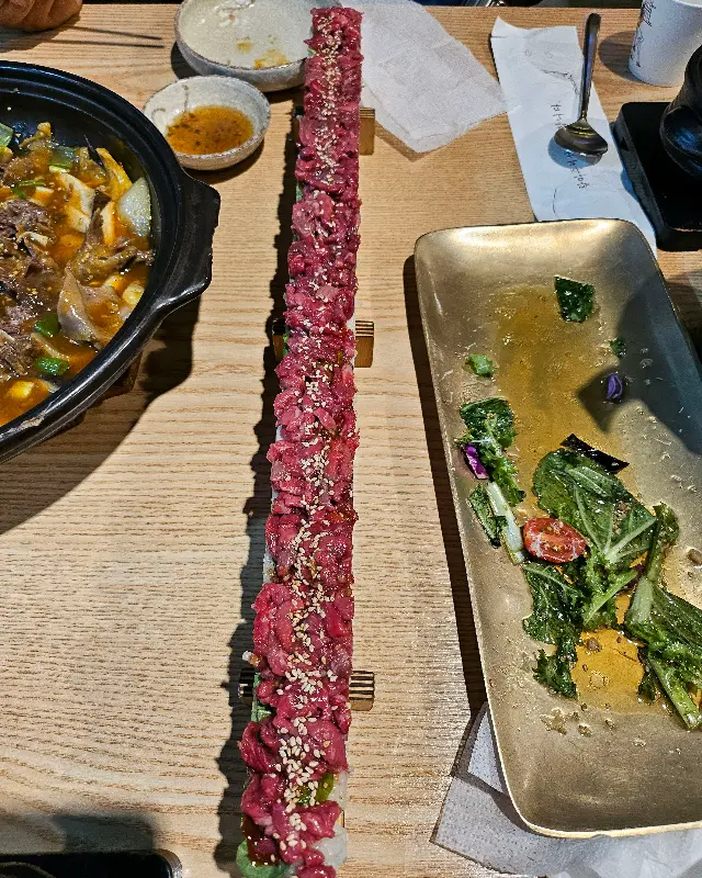 드디어 기다리고 기다리던 육회초밥 등장! 55cm라는 어마어마한 길이에 입이 떡 벌어졌어. 윤기가 좔좔 흐르는 육회가 밥 위에 듬뿍 올려져 있는데, 진짜 비주얼 쇼크! 사진을 안 찍을 수가 없더라. 인스타 스토리에 올렸더니 친구들 반응 난리 났잖아. 다들 어디냐고, 자기들도 데려가라고 난리 ㅋㅋㅋ
