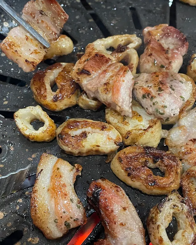 잘 익은 뒷고기 한 점을 딱 집어서 입에 넣는 순간… 와… 진짜 레전드. 쫄깃쫄깃하면서도 고소한 게, 지금까지 먹어본 뒷고기랑은 차원이 다르더라. 잡내 하나 없고, 불판에 구우니까 겉은 바삭하고 속은 촉촉한 게 진짜 예술이었다. 같이 나온 소스에 콕 찍어 먹으니까 감칠맛 폭발! 멈출 수 없는 맛에 순식간에 흡입했다.
