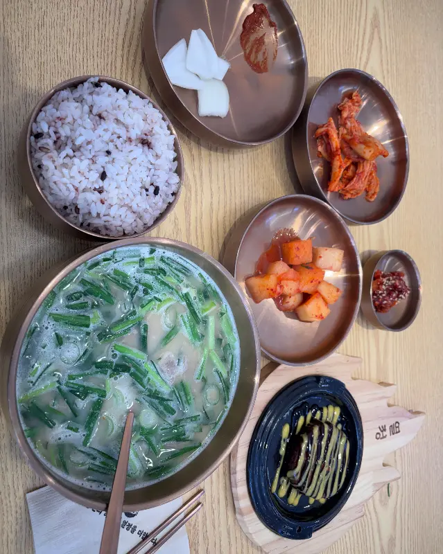 드디어 기다리고 기다리던 얼큰살코기국밥 등장! 놋그릇에 담겨 나오는데, 비주얼부터가 장난 아니더라고. 뽀얀 국물 위에 송송 썰린 파가 듬뿍 올라가 있고, 그 위로 깨가 솔솔 뿌려져 있어. 얼큰한 향이 코를 찌르는 게, 침샘을 자극하더라니까. 사진 보니까 또 먹고 싶어지네.