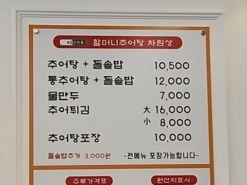 아, 그리고 여기 포장도 된다고 하더라. 혼자 사는 사람이나, 집에서 편하게 추어탕을 즐기고 싶은 사람들은 포장해서 먹어도 좋을 것 같아. 나도 다음에 부모님 갖다 드리려고 포장해갈까 생각 중이야.