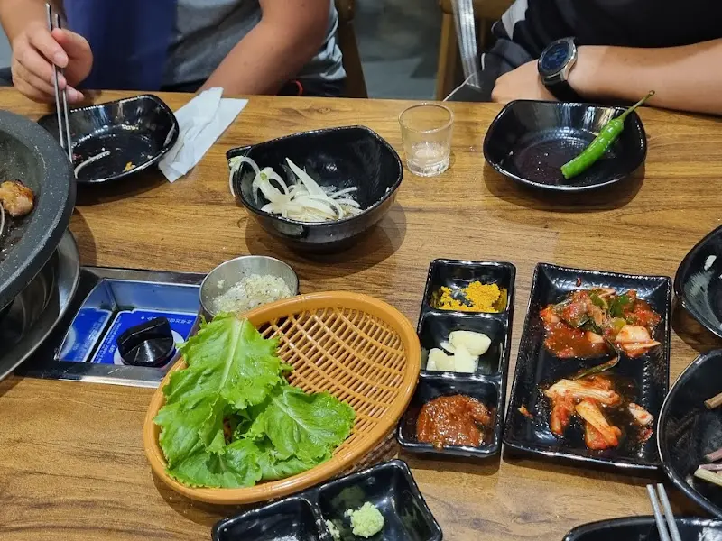 잘 익은 삼겹살 한 점을 깻잎 위에 올리고, 쌈장 콕 찍은 마늘과 함께 쌈 싸먹으니… 와… 이거 진짜 미쳤다! 육즙이 팡팡 터지면서 입 안 가득 퍼지는 고소함! 깻잎의 향긋함과 마늘의 알싸함까지 더해지니, 천상의 맛이 따로 없었다.