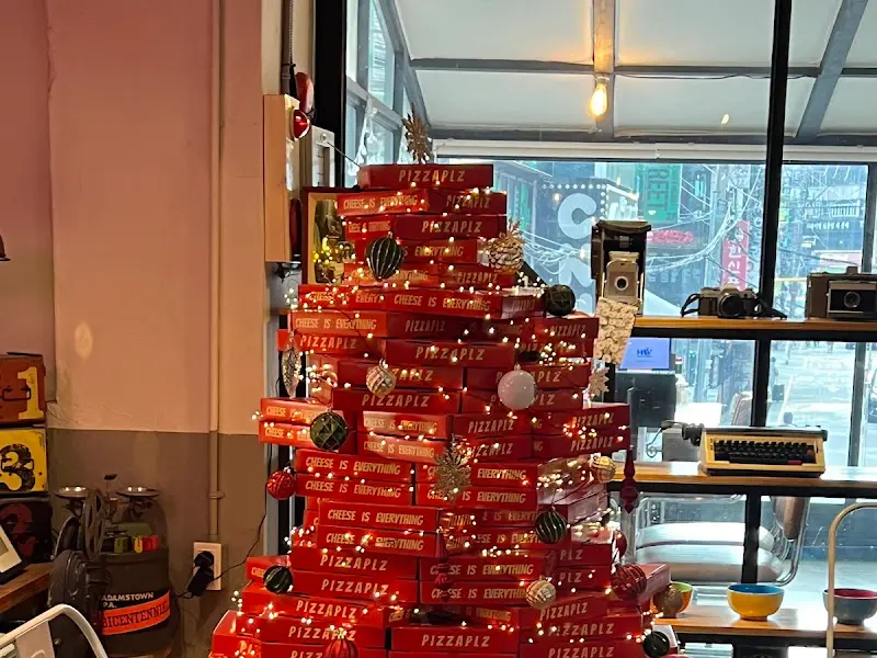 문을 열고 들어서는 순간, 분위기에 압도당했다. 힙스터 감성 제대로! 벽돌로 된 벽에 빔프로젝터로 뮤직비디오가 나오고, 은은한 조명이 분위기를 더했다. 테이블 간 간격도 넓어서 편안하게 식사할 수 있을 것 같은 느낌적인 느낌! 특히 눈에 띈 건 피자 박스로 만든 트리였다. 를 보면 알겠지만, 빨간 피자 박스를 층층이 쌓아 올리고, 반짝이는 전구와 앙증맞은 장식들을 더해서 크리스마스 분위기를 물씬 풍겼다. 이런 센스, 진짜 배우고 싶다.