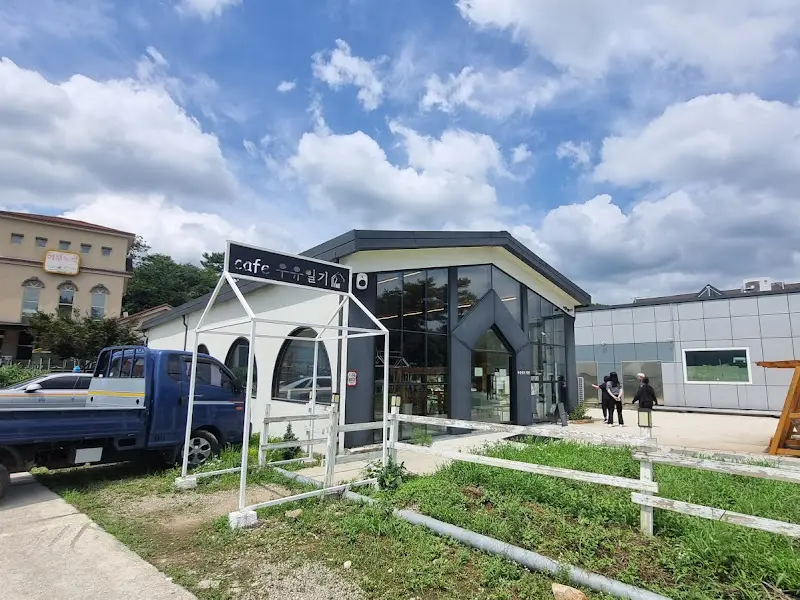 카페에 가까워질수록, 멀리서부터 독특한 외관이 눈에 들어왔다. 마치 커다란 창고를 개조한 듯한 모습이었다. 카페 앞에는 트랙터와 기차처럼 연결된 조형물이 놓여 있었고, 울타리와 짚단이 쌓여 있어 목장의 분위기를 한층 더했다. 마치 동화 속으로 들어온 듯한 기분이었다. 에서 보듯, 푸른 하늘과 흰 구름을 배경으로 서 있는 카페의 모습은 그 자체로 한 폭의 그림 같았다.