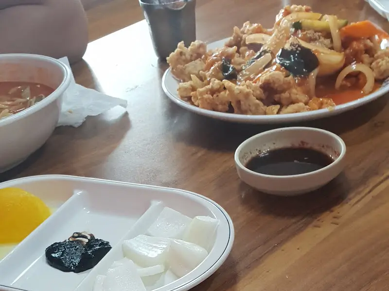 기본 반찬으로는 단무지, 양파, 춘장이 나오는데, 탕수육 소스에 양파 듬뿍 찍어 먹으면 진짜 꿀맛인 거 알지? 그리고 짜장 소스 모자라면 밥 비벼 먹어도 된다고 하더라고. 인심도 후한 집이야.