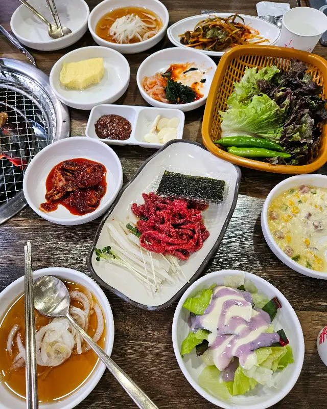 잘 익은 생갈비 한 점을 멜젓에 콕 찍어 입안에 넣으니, 육즙이 팡 터져 나왔다. 쫄깃하면서도 부드러운 식감, 담백하면서도 고소한 맛이 환상적인 조화를 이루었다. 신선한 쌈 채소에 싸서 먹으니, 풍미가 더욱 깊어졌다. 멜젓 특유의 감칠맛이 생갈비의 풍미를 한층 끌어올려 줬다.