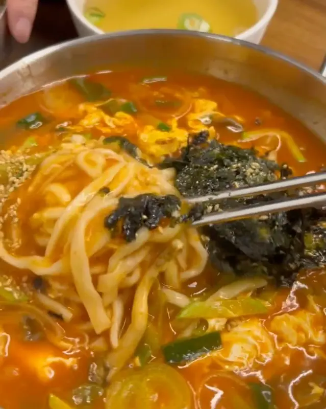 주문하고 얼마 안 돼서 바로 칼국수 등장! 비주얼부터가 장난 아니다. 칼칼한 냄새가 코를 찌르는 게, 침샘 폭발 직전. 면발 위에 김가루랑 깨가 팍팍 뿌려져 있는데, 진짜 먹음직스럽다. 국물 색깔도 딱 봐도 진하고 얼큰해 보이는 게, 완전 내 스타일!