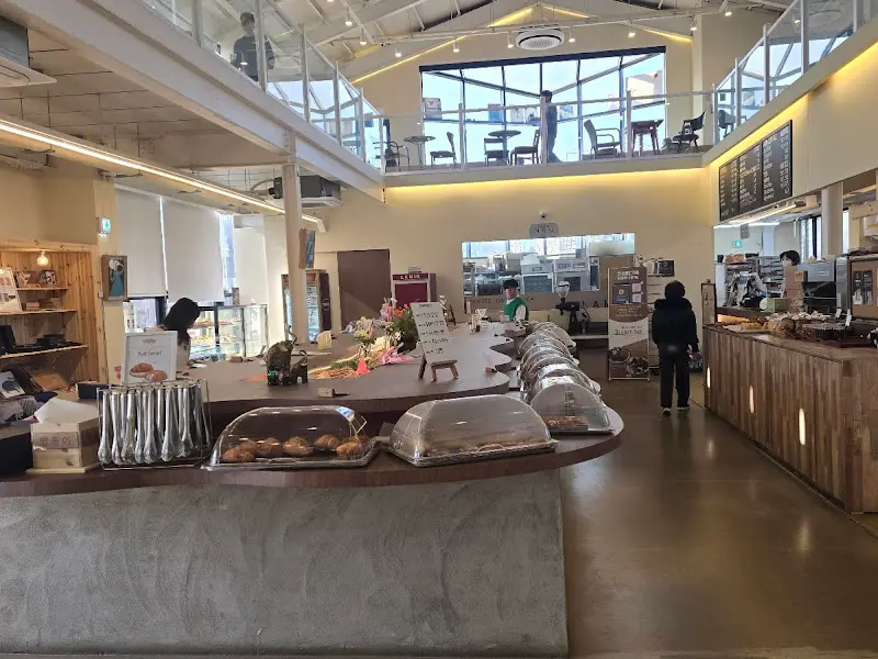 카페 문을 열고 들어서는 순간, 예상했던 것보다 훨씬 더 넓고 쾌적한 공간이 눈앞에 펼쳐졌다. 높은 천장과 탁 트인 구조 덕분에 개방감이 느껴졌고, 은은하게 퍼지는 빵 굽는 향기는 후각을 자극하며 기분 좋은 설렘을 안겨주었다. 1층과 2층으로 나뉜 공간은 각각 다른 매력을 뽐내고 있었다. 1층은 다양한 빵들이 진열된 공간과 테이블들이 조화롭게 배치되어 있었고, 2층은 1층을 내려다볼 수 있는 구조와 함께 더욱 여유로운 좌석들이 마련되어 있었다. 특히 통창 너머로 펼쳐지는 용담저수지 뷰는 그야말로 압권이었다.