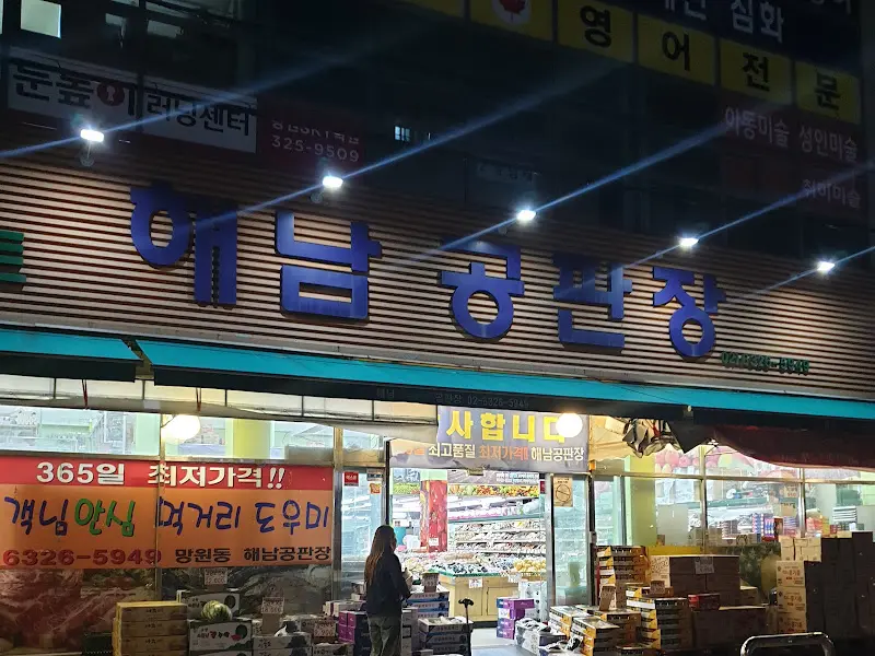 해 질 녘, 붉은 노을이 짙게 드리운 연남동 거리를 걸었다. 드문드문 켜진 가로등 불빛이 묘하게 낭만적인 분위기를 자아냈다. 드디어 눈앞에 나타난 해남공판장은 생각보다 훨씬 큰 규모를 자랑했다. 건물 전면에 푸른색으로 큼지막하게 쓰인 “해남공판장” 글자가 멀리서도 한눈에 들어왔다. 365일 최저 가격이라는 문구와 함께, “싸다! 맛있고 신선한 먹거리 도우미”라는 문구가 적혀 있어 기대감을 한껏 고조시켰다.