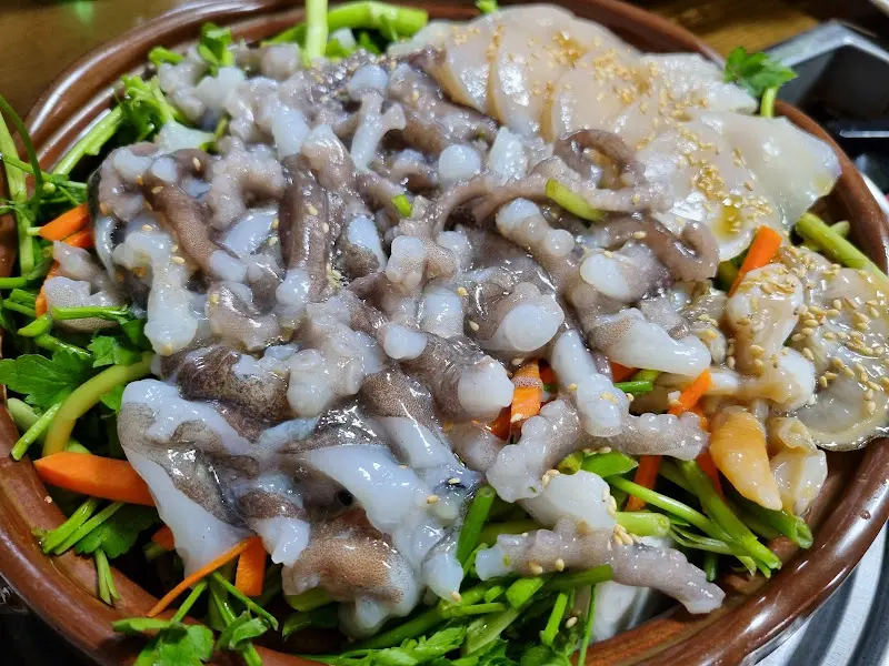 잠시 후, 드디어 기다리고 기다리던 낙지삼합이 등장했다. 넓적한 뚝배기 같은 돌판에 푸짐하게 담겨 나온 모습은 그야말로 장관이었다. 싱싱한 산낙지와 키조개가 넉넉하게 올려져 있고, 그 아래에는 갖가지 채소가 알록달록한 색감을 뽐내고 있었다. 사진으로 미처 담아내지 못했지만, 꿈틀거리는 낙지의 생생함은 신선함을 그대로 증명하는 듯했다. 쟁반 가득히 차려진 밑반찬들도 눈길을 사로잡았다. 꼬시래기 무침, 묵은지 김치 등 다른 식당에서는 쉽게 볼 수 없는 정갈한 반찬들이 입맛을 돋우었다. 특히 매생이국은 따뜻하고 부드러운 맛이 일품이었다.
