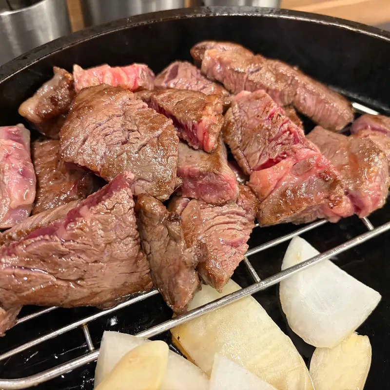드디어 등장한 등심은, 뜨겁게 달궈진 무쇠 팬 위에서 지글거리는 소리를 내며 시각과 청각을 동시에 자극했다.