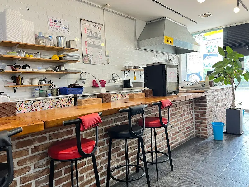 미가옥에 도착하니, 생각보다 훨씬 깔끔한 외관이 눈에 띄었다. 왠지 모르게 기대감이 상승! 문을 열고 들어가니 환한 조명과 깨끗한 테이블이 맞아주었다. 벽돌로 쌓은 카운터 테이블과 빨간색 의자가 인상적이었다. 혼자 온 손님들도 부담 없이 앉을 수 있는 바 테이블이 있어서 좋았다. 나는 창가 쪽 자리에 앉아 메뉴를 살펴보았다. 콩나물국밥 종류가 다양했는데, 뭘 먹을까 고민하다가 얼큰한 국물이 땡겨서 얼큰 콩나물국밥에 오징어를 추가하기로 했다.