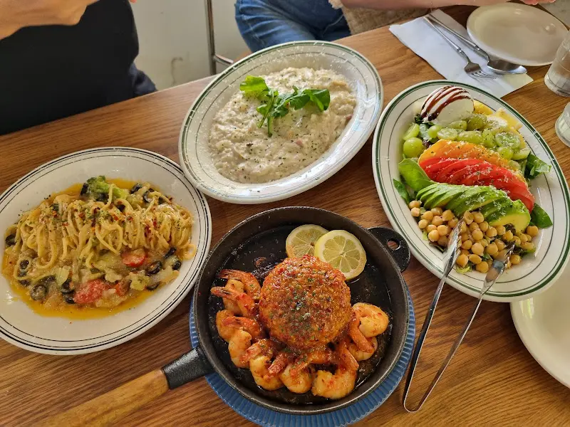 테이블 위에 놓인 파스타, 리조또, 샐러드, 하와이안 쉬림프 라이스