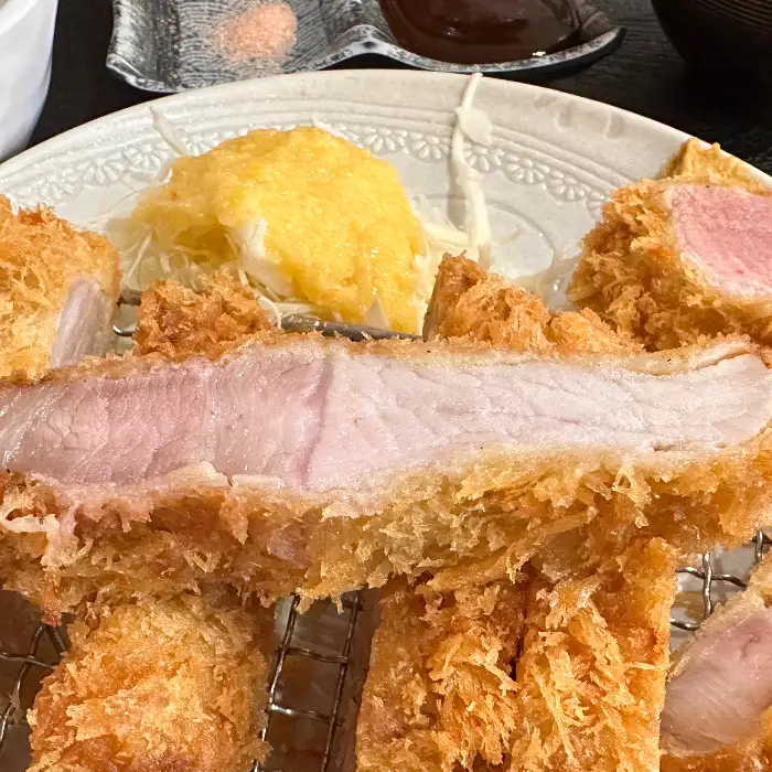 등심(로스카츠)도 빼놓을 수 없죠. 히레카츠와는 또 다른 매력이 있더라고요. 씹는 맛이 살아있는 쫄깃함과 풍부한 육즙이 어우러져서, 씹을수록 고소한 맛이 일품이었어요. 어떤 분들은 등심이 안심보다 살짝 질기다고도 하시던데, 저는 오히려 그 씹는 맛 때문에 더 맛있게 느껴졌어요. 15일에 걸쳐 고기를 숙성시킨다고 하는데, 그 정성이 맛으로 고스란히 느껴지는 것 같았죠.