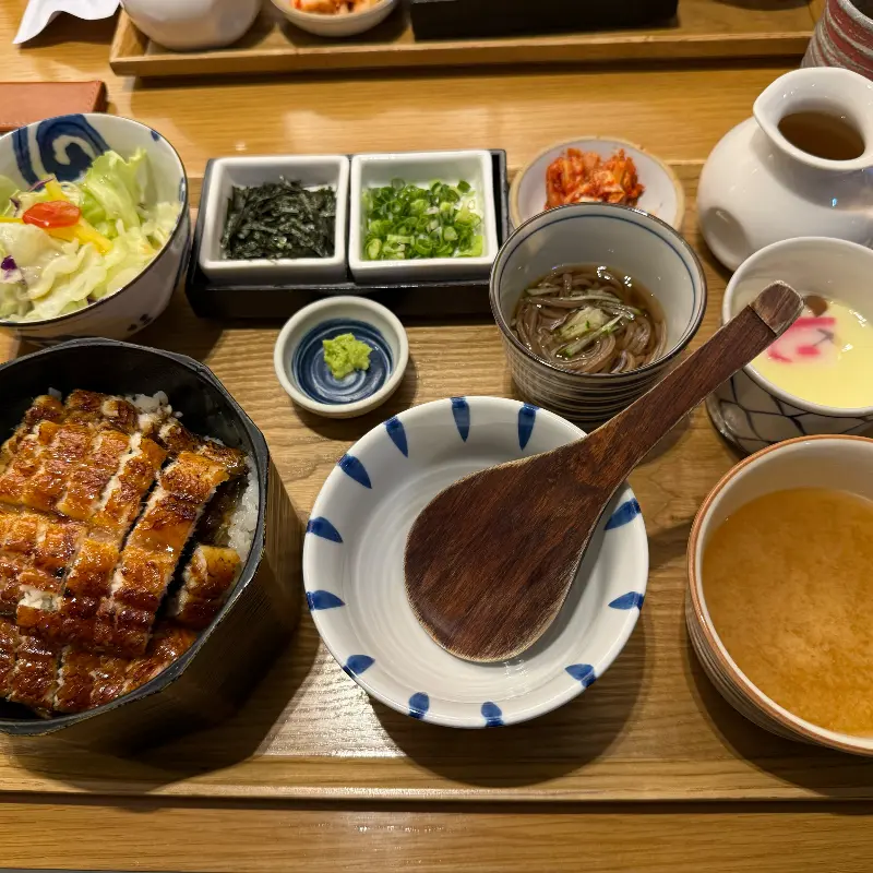드디어 기다리고 기다리던 히츠마부시가 나왔는데, 이야, 그 모습이 정말이지 예술이더라. 윤기가 좔좔 흐르는 장어하며, 정갈하게 담겨 나온 반찬들까지, 마치 임금님 수라상을 받은 듯한 기분이었어. 나무 그릇에 담긴 장어덮밥은 보기만 해도 입맛이 확 도는 비주얼이었는데, 얼른 맛보고 싶은 마음을 겨우 참았지.