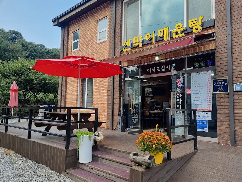 드디어 도착한 곳은 ‘산마루아래메운탕’. 낡은 듯 정감 있는 간판이 세월의 흔적을 고스란히 보여주는 듯했어. 건물 외관은 소박했지만, 왠지 모르게 마음이 편안해지는 분위기였지. 빨간 파라솔이 드리워진 야외 테이블에 앉아 시원한 바람을 쐬니, 어릴 적 마루에 앉아 할머니 부채질을 받던 기억이 떠올랐어.