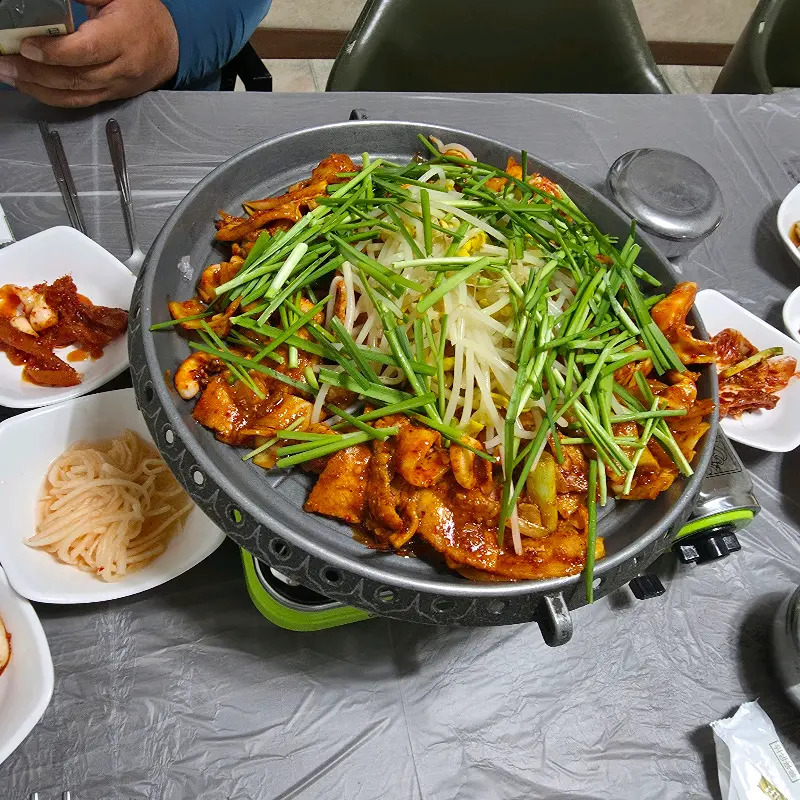 드디어 기다리고 기다리던 오삼불고기가 나왔어. 둥근 철판 가득 빨갛게 양념된 오삼불고기 위에 콩나물과 부추가 듬뿍 올려져 있는 모습이 정말 먹음직스럽더라. 사진을 안 찍을 수가 없었어. 얼른 카메라를 꺼내 사진을 찍고, 젓가락을 들었지. 불판 위에서 지글지글 익어가는 오삼불고기를 보니, 어릴 적 할머니가 해주시던 불고기 생각이 났어. 그때 그 따뜻한 밥상이 그리워지면서, 얼른 맛보고 싶어졌지.