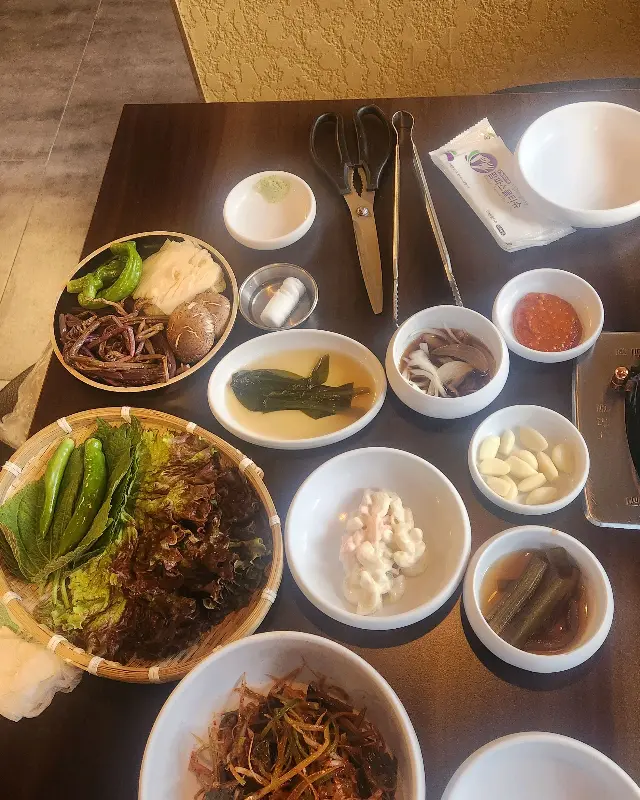 자리에 앉자마자, 푸짐한 밑반찬들이 눈 앞에 쫙 펼쳐지는데, 이야, 이것저것 맛깔난 것들이 한가득이야. 윤기가 좔좔 흐르는 고사리에, 톡 쏘는 파무침, 아삭아삭한 백김치, 향긋한 버섯까지. 특히 무한리필로 즐길 수 있는 귀한 명이나물이 떡하니 놓여있는 거 보고는 아주 그냥 입이 떡 벌어졌다니까. 멜젓 소스도 잊지 않고 챙겨주시는 센스하며, 깔끔하고 정갈한 밑반찬 하나하나에 얼마나 신경 쓰셨는지 느껴지더라.