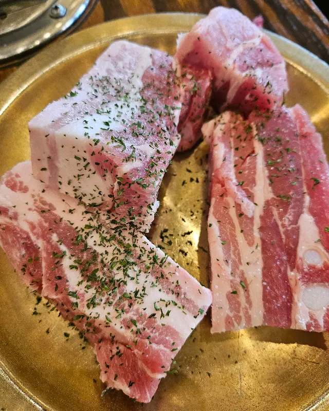 잠시 후, 숯불이 들어오고, 기다리고 기다리던 숙성 생삼겹이 등장했다. 선홍빛을 띠는 두툼한 고기는 신선함이 그대로 느껴졌다. 겉면에 뿌려진 허브 가루는 시각적인 풍미를 더했다. 불판 위에 고기를 올리자, 치익- 하는 소리와 함께 맛있는 냄새가 코를 자극했다. 잘 달궈진 불판 덕분에 고기는 순식간에 노릇노릇하게 익어갔다.