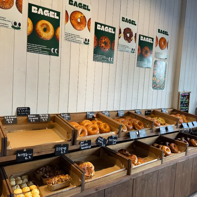 매장에 들어서자마자 눈에 확 들어오는 건 엄청나게 다양한 베이글 종류! 기본 플레인부터 시작해서 치즈, 블루베리, 심지어 명란 베이글까지… 진짜 없는 게 없어. 결정 장애 제대로 와버렸잖아. 하나하나 다 먹어보고 싶은 비주얼이라 진심 힘들었다.