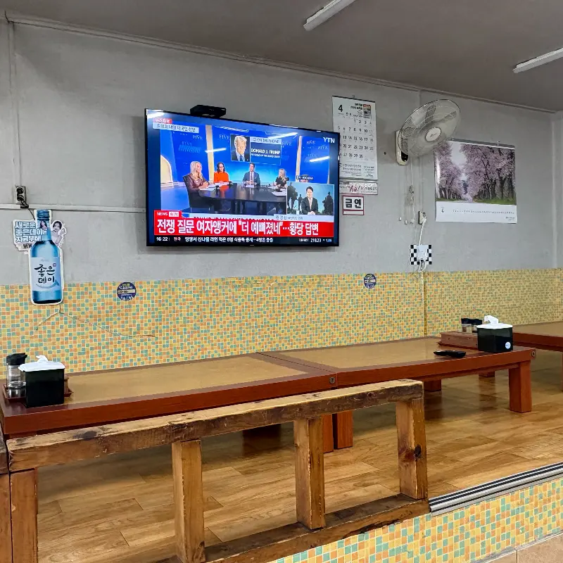 가게 문을 열자 정겨운 분위기가 물씬 풍겼습니다. 테이블 위에는 가지런히 놓인 수저와 냅킨, 그리고 따뜻한 물 한 잔이 놓여 있었습니다. 벽 한쪽에는 오래된 달력과 함께 정겨운 그림들이 걸려 있었고, 낡은 듯 하지만 깨끗하게 관리된 실내는 세월의 흔적과 함께 이곳을 찾은 수많은 사람들의 추억을 고스란히 담고 있는 듯했습니다. 점심시간이 조금 지나서인지, 다행히 기다림 없이 자리에 앉을 수 있었습니다.